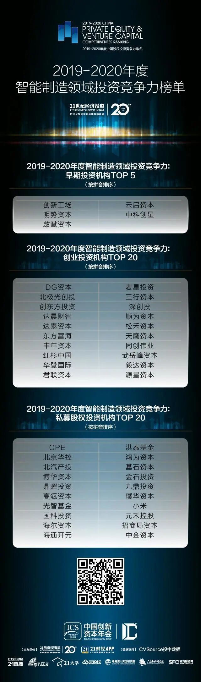 在以智能制造作为重点关注方向的诸多投资机构中,21世纪经济报道、21创新资本研究院通过对数百家投资机构的调研、走访与问卷发放,收集各基金募资,智能制造领域投资、退出,及被投项目的后续轮融资等业绩表现,同时参考第三方机构CVSource投中数据的数据,再结合行业专家评委会对拟上榜机构在ESG等方面的考量,“2019-2020年度智能制造领域投资竞争力榜单”由此新鲜出炉。